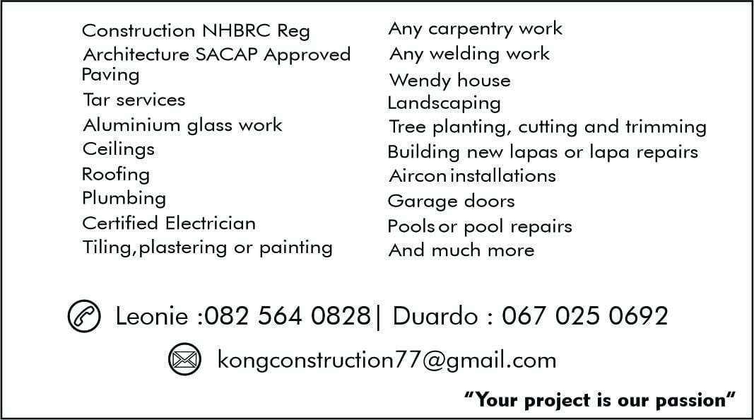 We value the relationships we built with our customers over the years that's why we deliver the utmost best service and customer consultations, so our customers can make informed decisions. At Kong Construction we build careers!